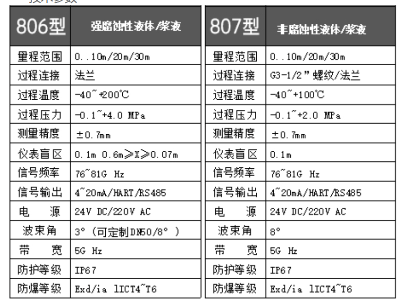 L-800高频雷达液位计包含26GH2、80GHz及以上高频微波技术的物位测量设备,通过非接触式测量方式实现对液体、浆料及颗粒料的精确检测,能在杂环境下工作,如温度、压力变化大、有惰性气体或蒸汽存在的场合。该设备在-40℃至300℃温度范围、-0.1至0.5MPa压力环境下均能稳定工作,尤其适合存在强粉尘、蒸汽、腐蚀性介质或搅拌等复杂工况的储罐、料仓等场景。其核心优势体现在波束角小(约3°)、测量盲区低至0.07m以下,支持S485/Modbus、4~20mA等多种信号输出方式,防护等级最高可达IP67,防爆等级为Exib ⅡCT6 Gb。