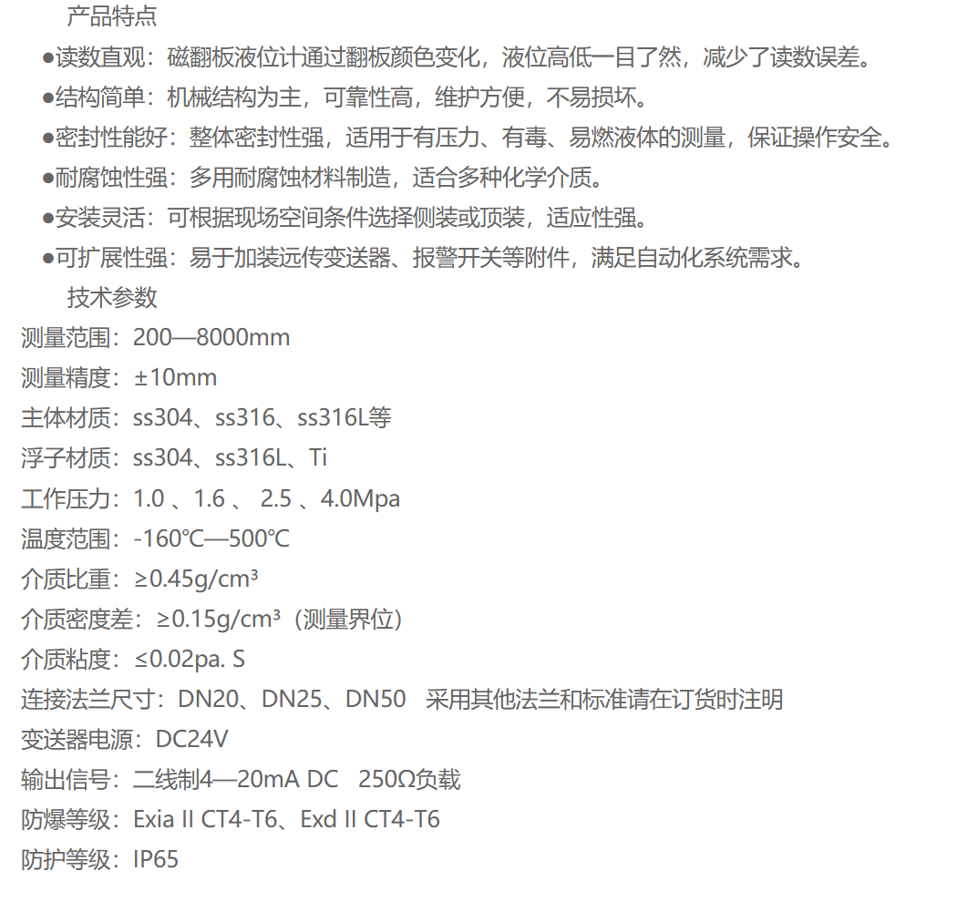 L-600磁翻板液位计通过翻板颜色的变化,操作人员能够清晰、直观地读取容器或罐体内的液位高度。适用于高温、高压、耐腐蚀的场合,具有高密封防泄漏的特点,能够指示容器内的液位高度,并可通过远传装置进行远程监控。广泛应用于化工、石油、电力、冶金、食品等行业的液体储罐和容器中。